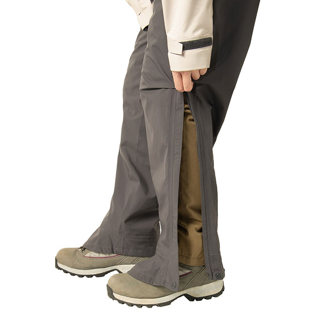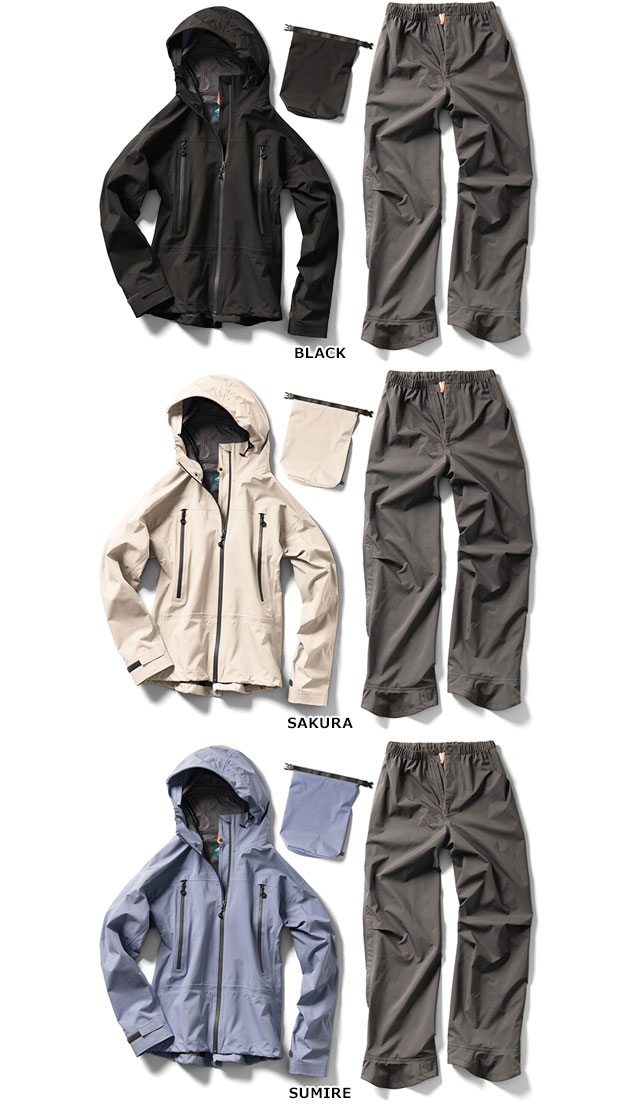 春から秋の日帰り登山でのレインウェアや防風アウターに、安心感のあるスペックと使いやすい機能性を備えたライトハイクモデルの『SHIRUBE RAIN SUITS(シルベ レイン スーツ)』がラインナップ。耐久性に優れ、しなやかでストレッチ性のある3レイヤー防水透湿生地を使用した、ジャケット・パンツ・収納袋の3点セットのレインウェアです。圧のかかりやすい肩と内股の縫製をなくし、防水性を高めています。また、袖口調節テープや、パンツ裾のアーチ状カバーが雨の浸水を軽減。ポケット内にはドットの通気口があり、ウェア内のムレを軽減します。フードは顔が濡れにくいひさし形状で視界を邪魔せず、ワンアクションで2方向にフィット調整ができるフード調節コード付き。さらに、サイドの大きなファスナー開閉で靴を履いたままパンツの着脱が可能です。足あげしやすい膝のタックもポイント。羽織りで着用できるサブボタンもついているので、ハイキングやレジャーにはもちろんデイリーにも活躍します。防水生地を使用したロールトップ式のスタッフバッグ付で持ち運びもしやすく、年齢や経験に関係なく、山歩きを楽しみたいすべての人におすすめのアイテムです!