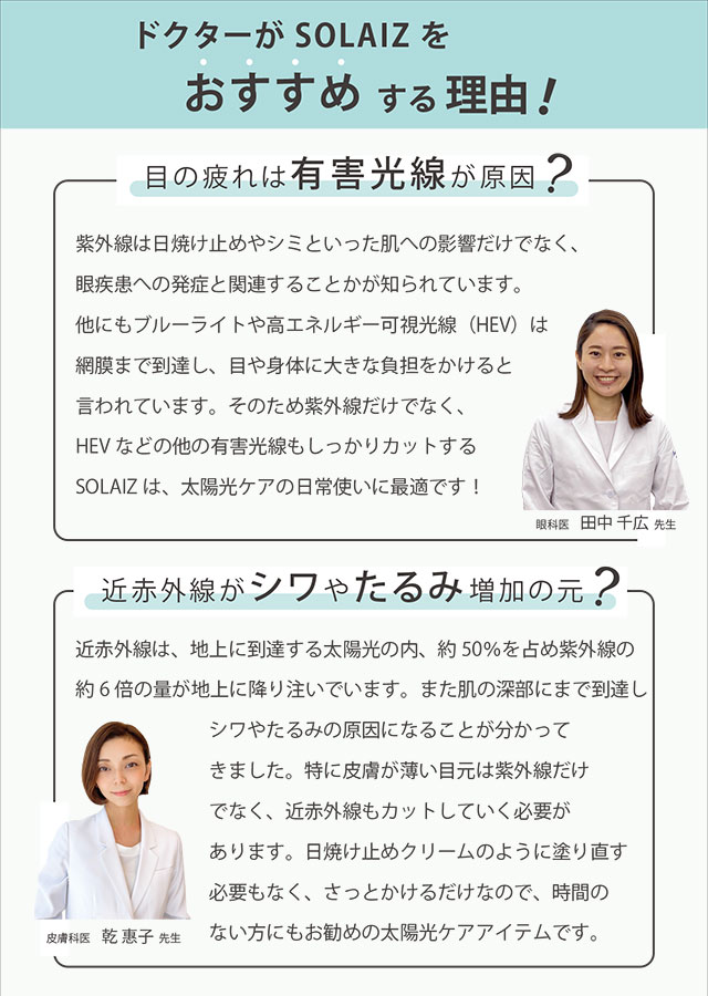 『SOLAIZ(ソライズ)』は、メガネの産地福井県にあるERICA OPTICAL(エリカ オプチカル)が手がけるオリジナルのブランドです。さっと羽織るアウターのように気軽にかけられる。たった1秒でできるエイジングケア。そこから生まれる豊かな時間。SOLAIZは、忙しい毎日をおくるすべての人に寄り添うEYE[i]&SKINCARE(アイアンドスキンケア)グラスです。