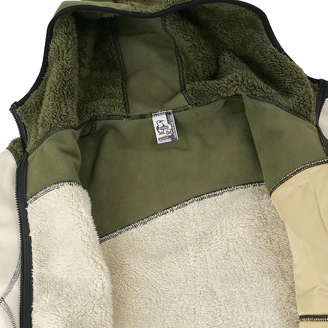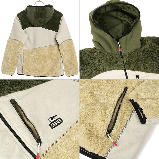 防風性のある肉厚なボンディングフリース生地のジップパーカーです。裏地が毛足の短いマイクロフリースなので、防風性、保温性を保ち、着心地も抜群。ふわふわで肌触りが良く、首から頭周りもしっかりと防寒。生地の毛足の長さの違う表裏を切り替えに合わせて組み合わせる事で今までのシリーズとは一味違う表情のジャケットにしています。胸はブービーフェイスをモチーフにした切り替えを入れてCHUMSらしさを出し、胸ポケットのパネルとしても機能しています。フード口、袖口、裾はバインダー仕様にしていますのですっきりとした着やすいデザイン。腰ポケットは胸ポケット同様ファスナーポケットにしていますので入れた物を落とさない機能的なデザインになっています。
