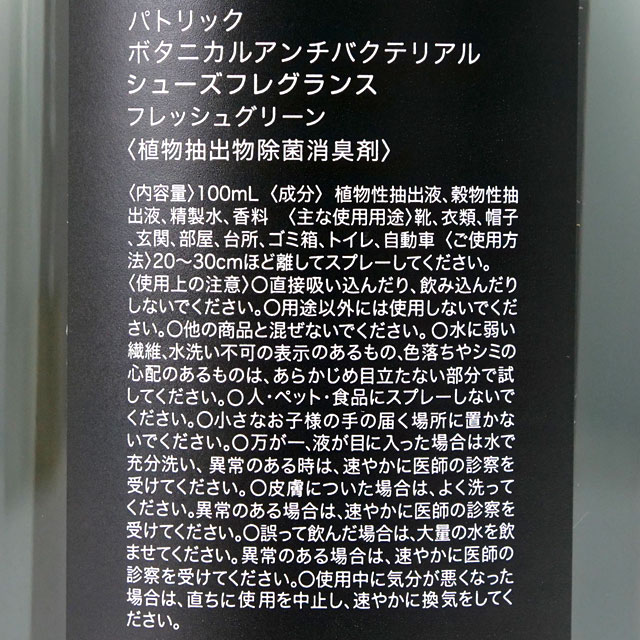 パトリック PATRICK ボタニカルアンチバクテリアル シューズスプレー [SS001 FW25] BOTA AN-BACTE SHOE SPRAY メンズ・レディース 日本製 靴ケア 消臭スプレー 除菌 FRESH-GREENERY 正規取扱店